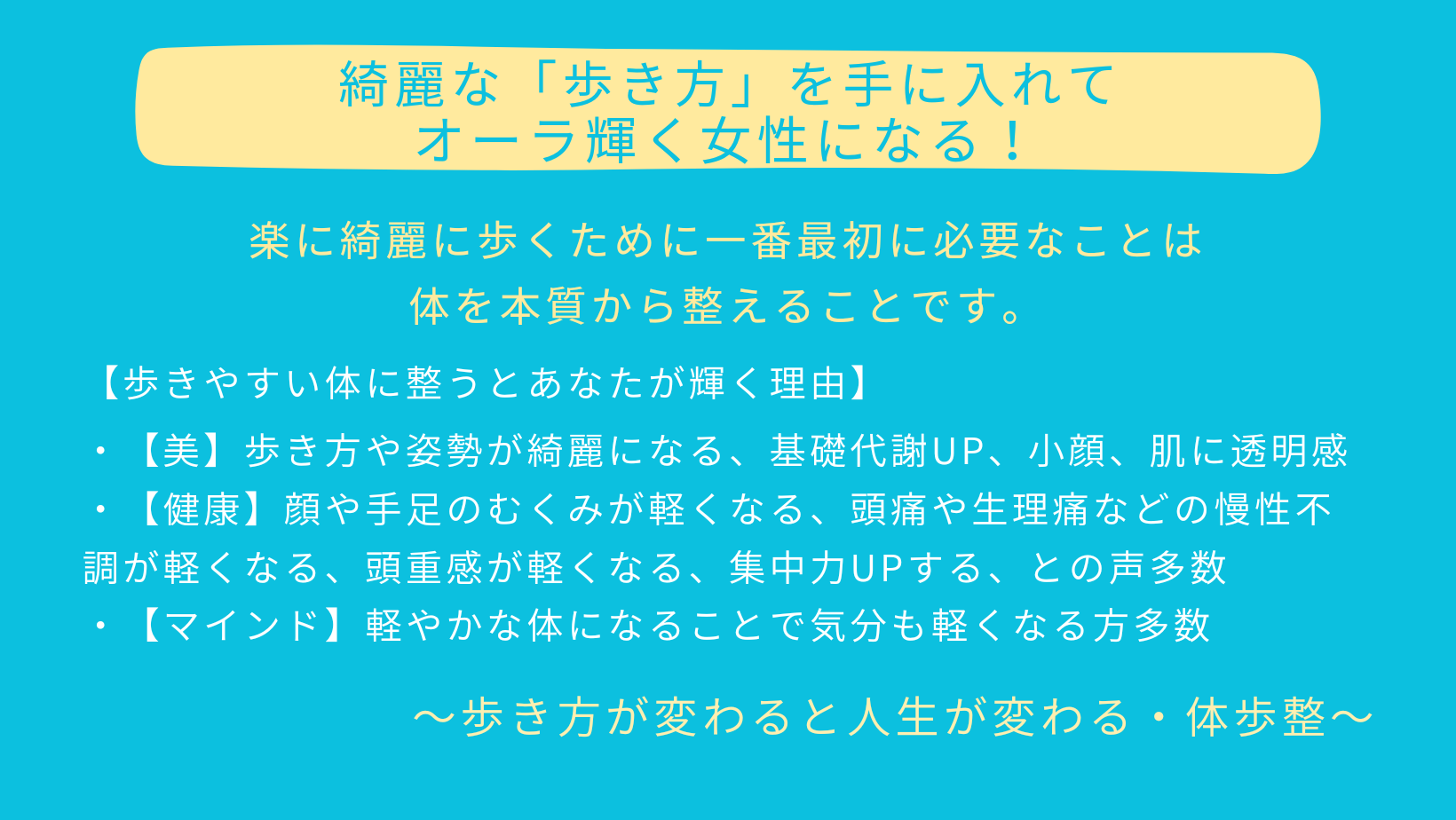★通常の施術以外に、体を整えることで綺麗と綺麗な歩き方を手に入れる(歩き方を変えて人生を変える)集中コースもございます。ご希望の方は、お問い合わせフォームからご連絡ください。詳細をご案内させていただきます。